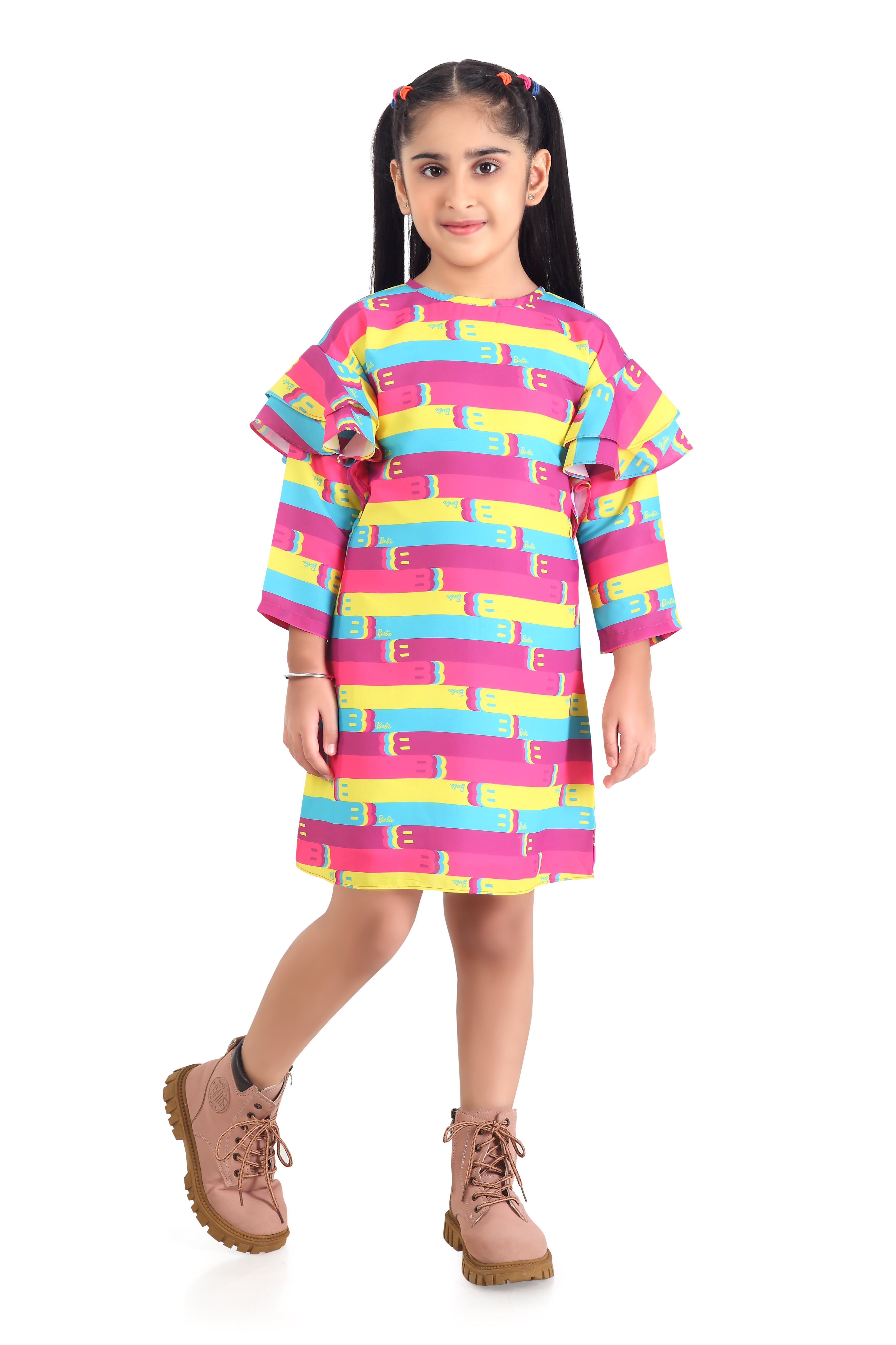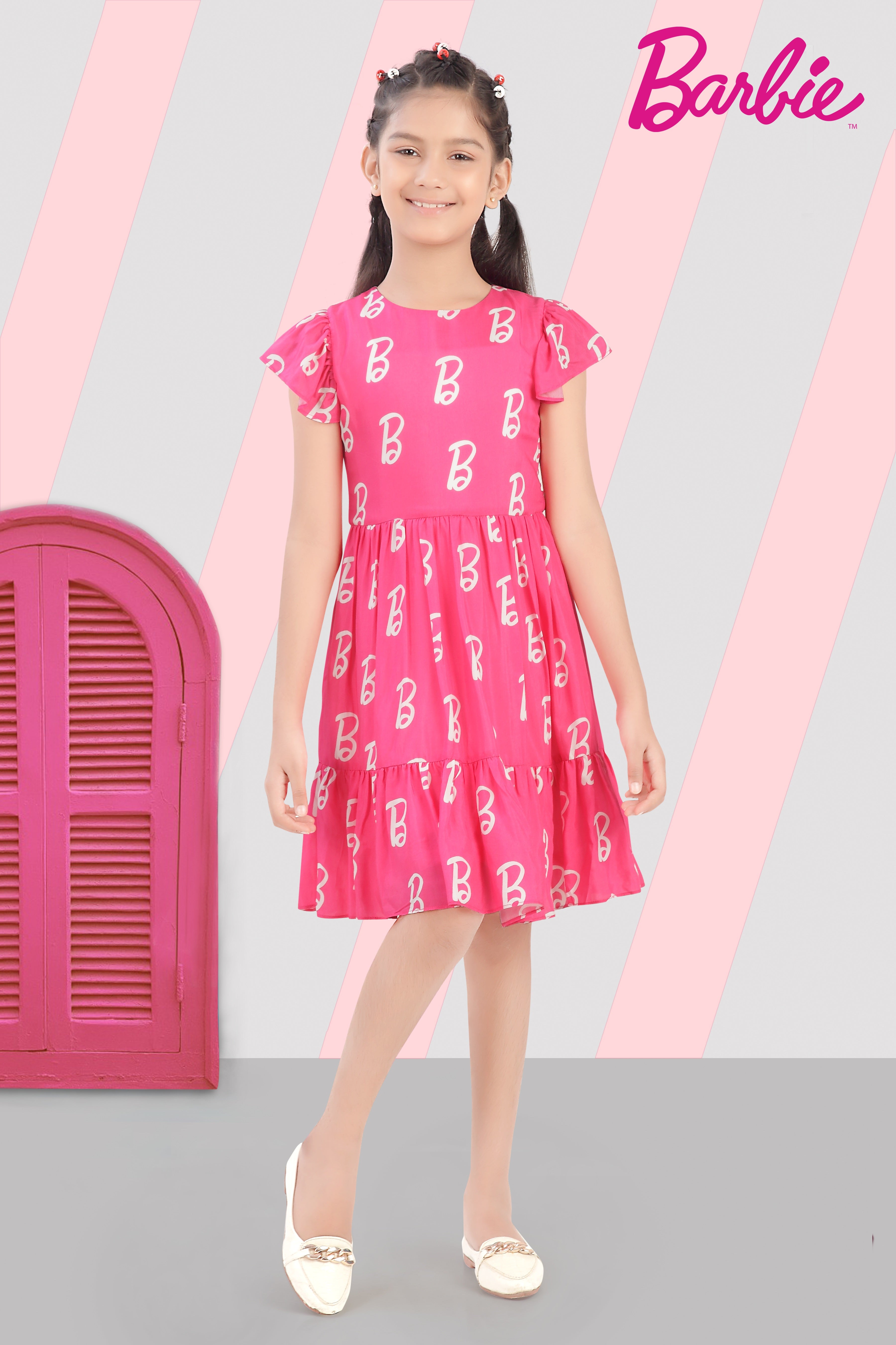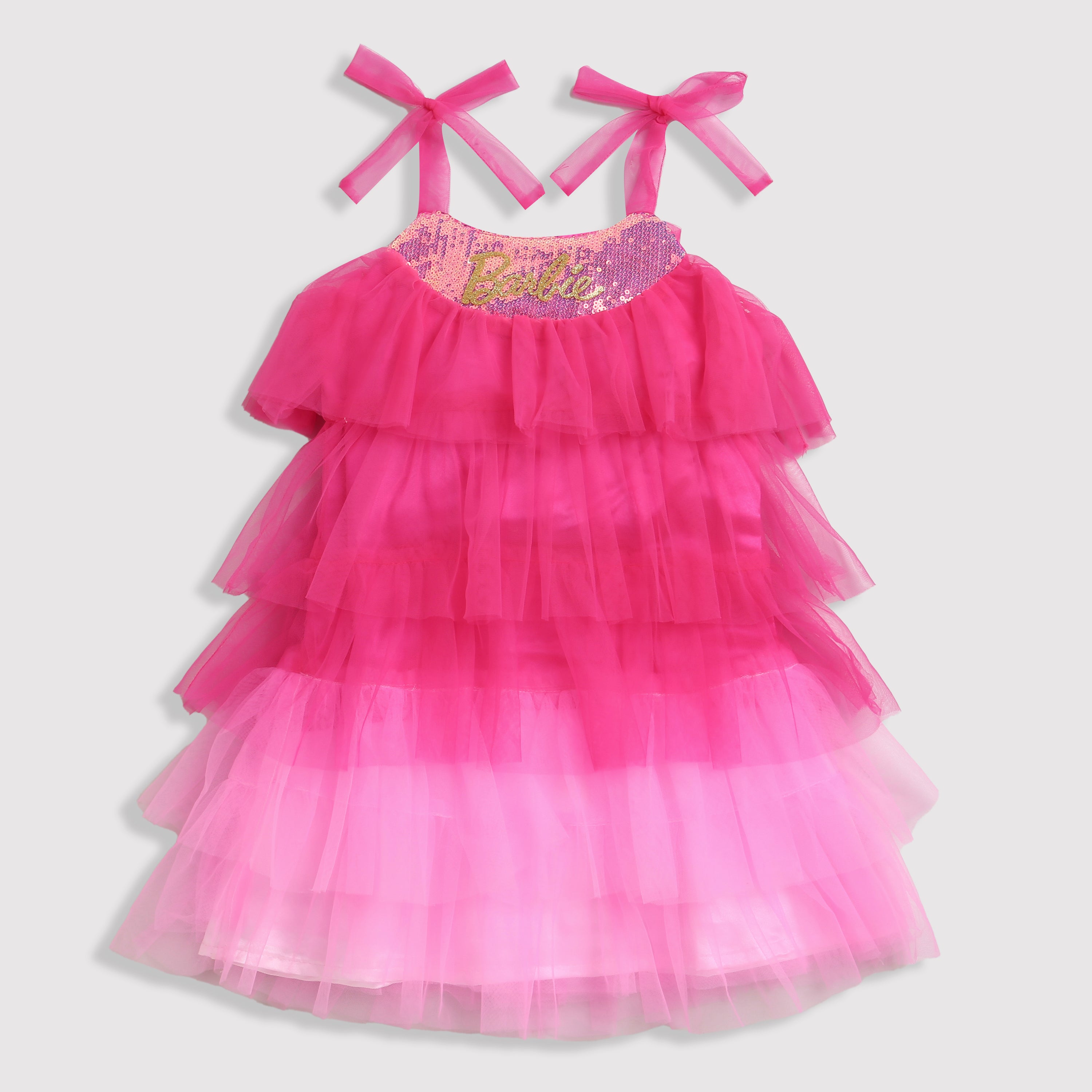 Barbie B Logo Printed Tiered Pink | Girls Stylish Party Dress India | Kids