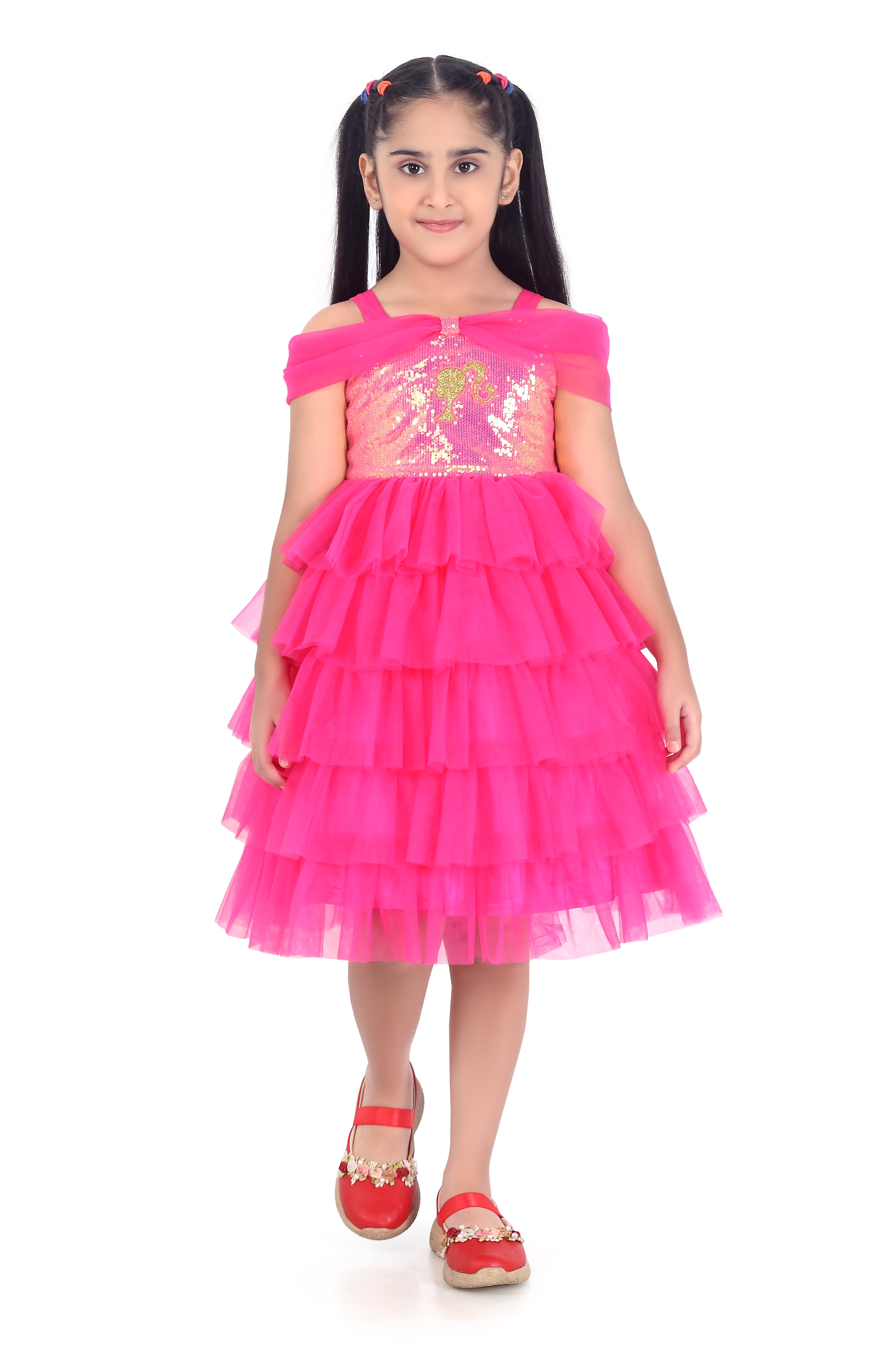 Barbie Hot Pink Satin Layered Sequin Dress For Girls | Stylish Birthday Outfit | Kids | Tiny Girl India