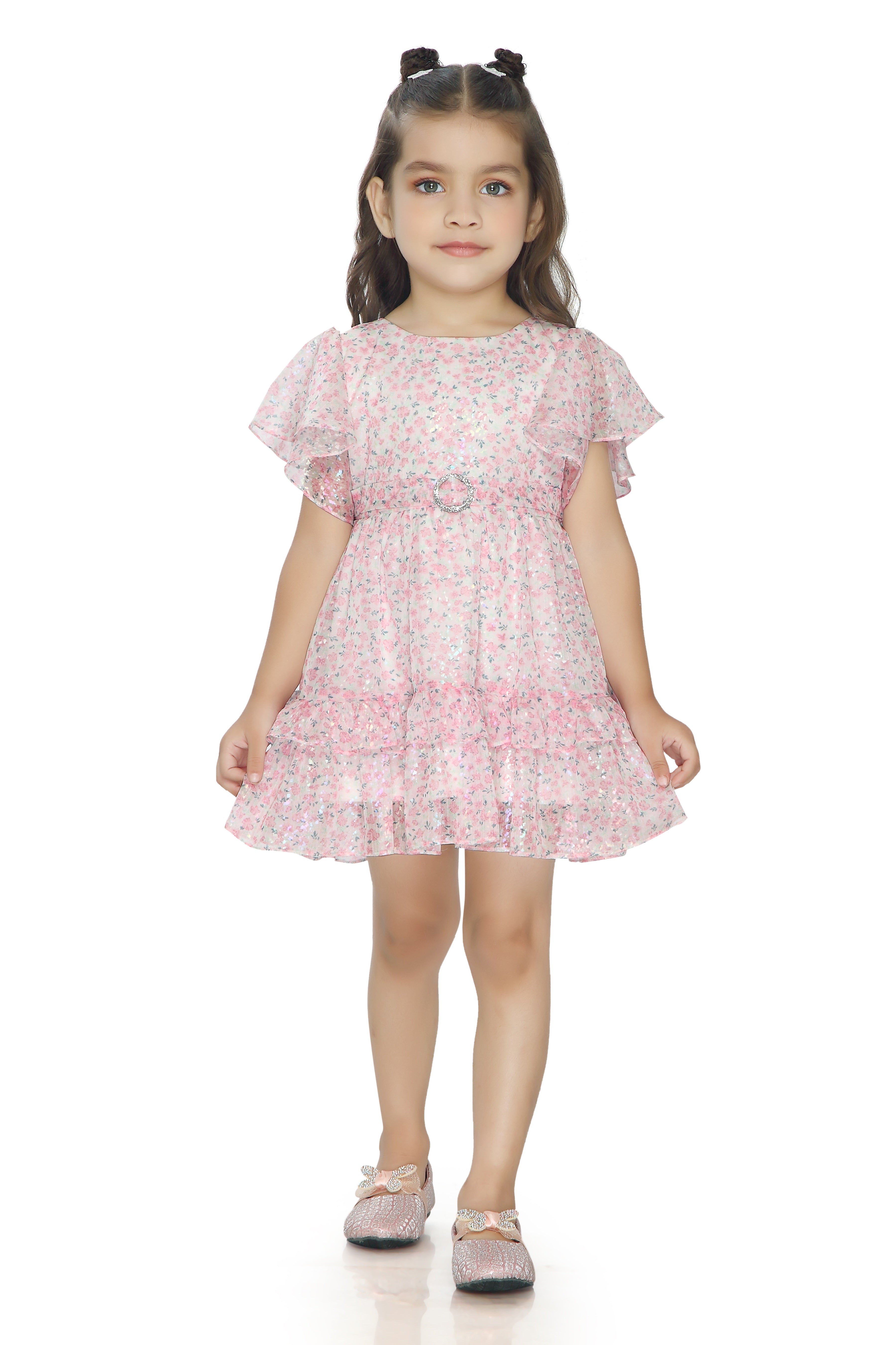 Tiny Girl Cap Sleeves Frilled Neckline All Over Floral Garden Theme Printed Midi Dress - Peach