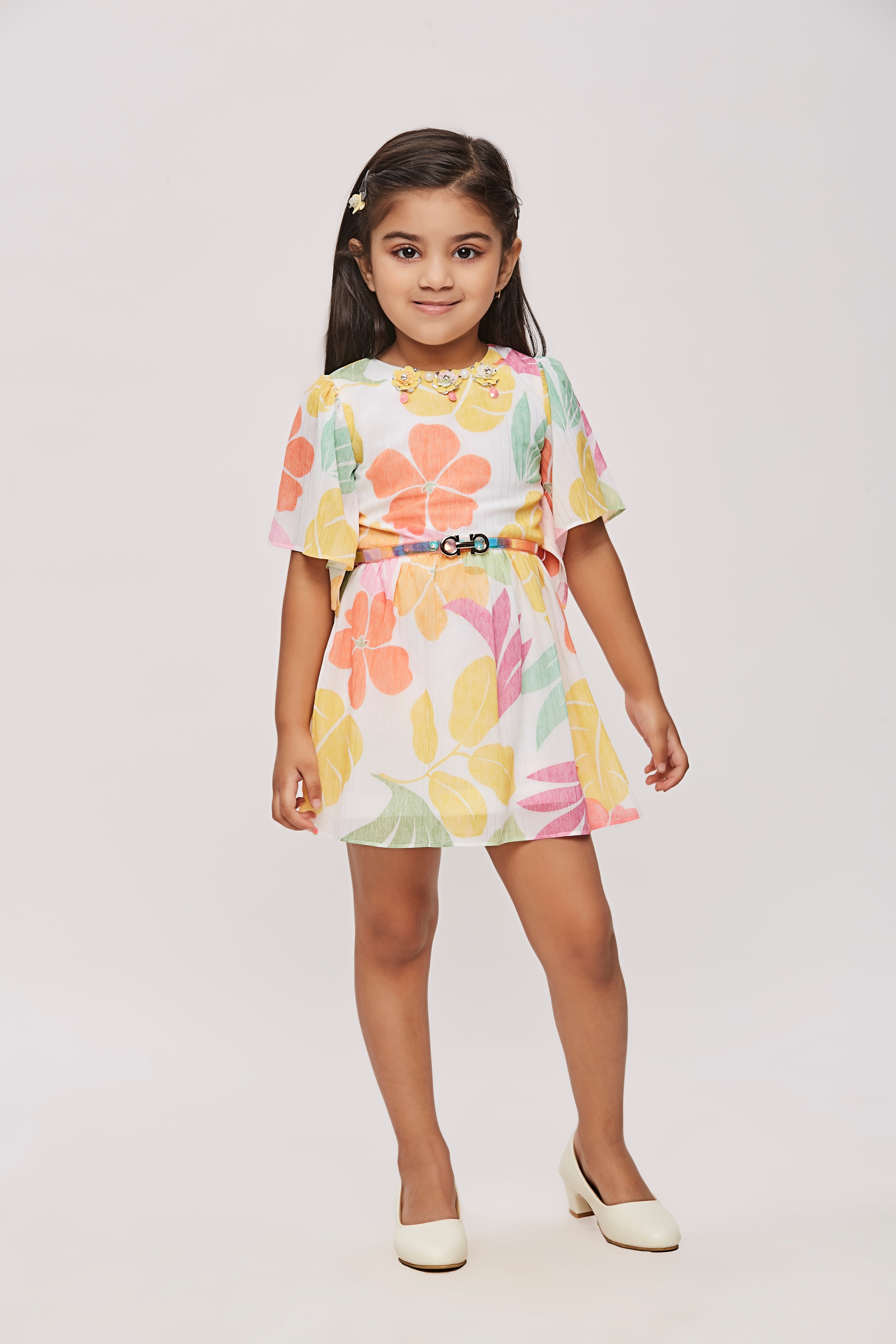 Tressel Floral Printed Frock with Pink Belt and Brooch