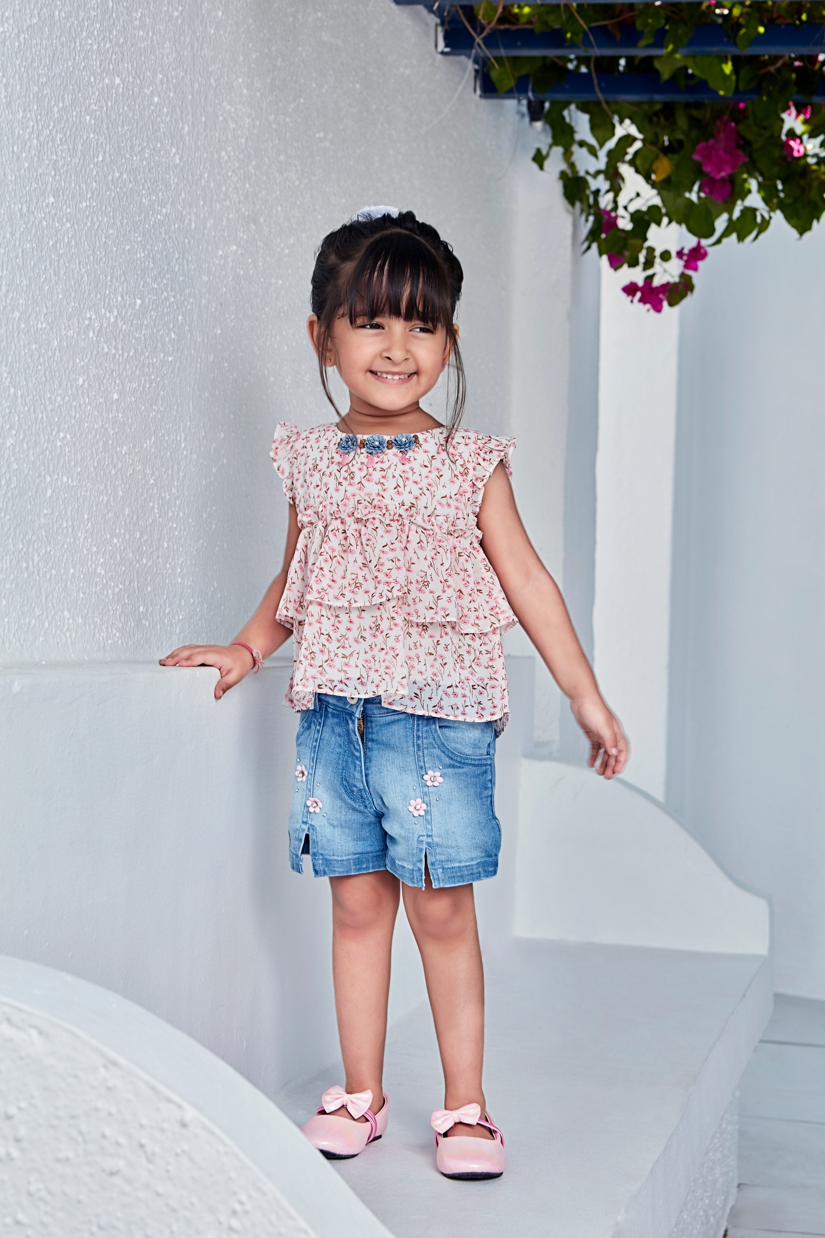 Tressel Kids Printed Top & Denim Short Set Included Belt