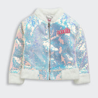 Barbie Iridescent Sequin Bomber Jacket For Girls | Party Wear Winter Outerwear | Kids | Tiny Girl India