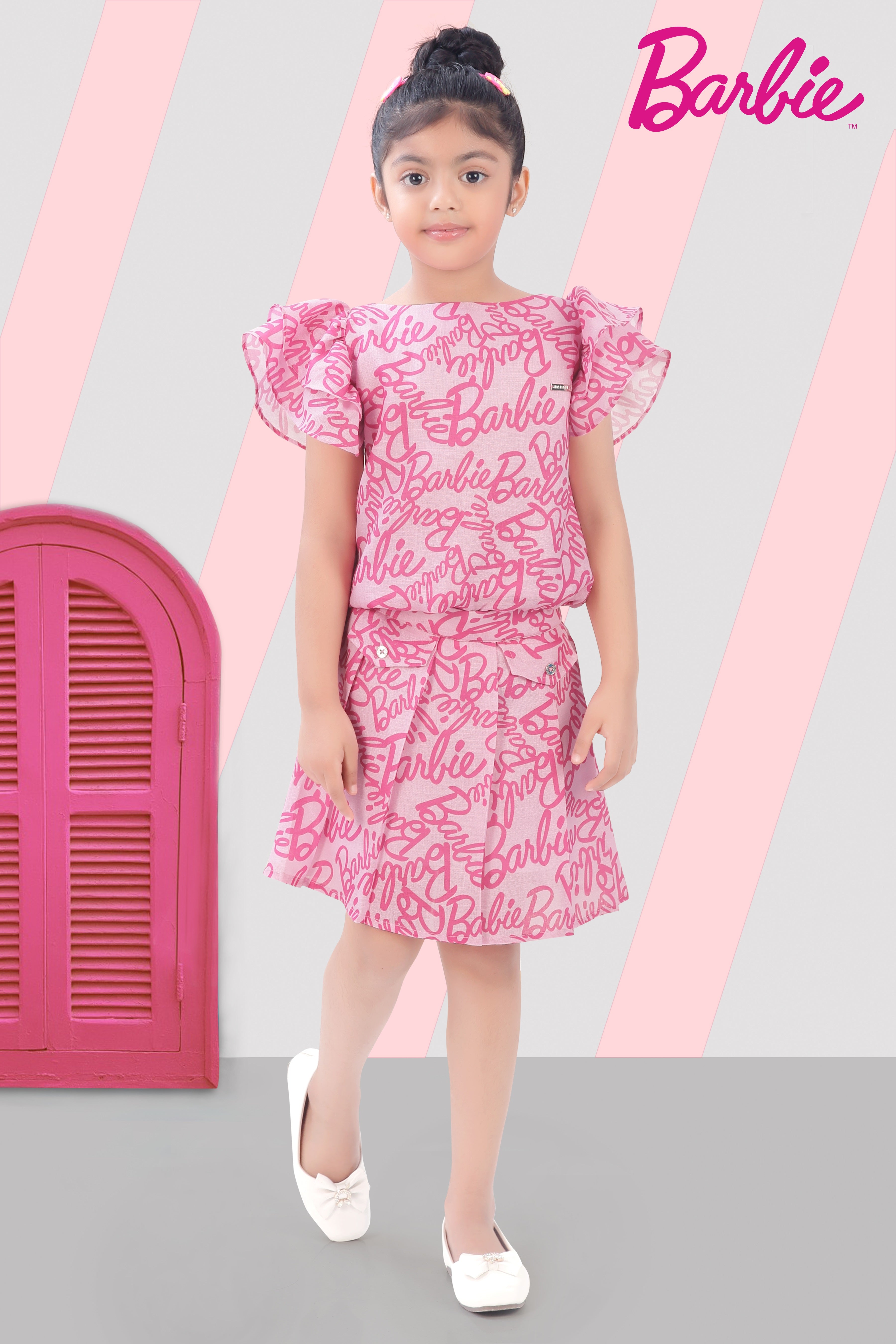 Pink Flutter-Sleeve Dress for Girls – Barbie Casual Wear
