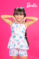 Let her express herself with this White Printed Peplum Co-ord Set, featuring playful Barbie icons all over. The peplum top with coordinating shorts adds flair and comfort to her wardrobe. Designed from soft cotton fabric, it’s perfect for all-day fun. The pastel hues make it great for day events or travel looks. A go-to favorite for moms who love durable yet fashionable kidswear!