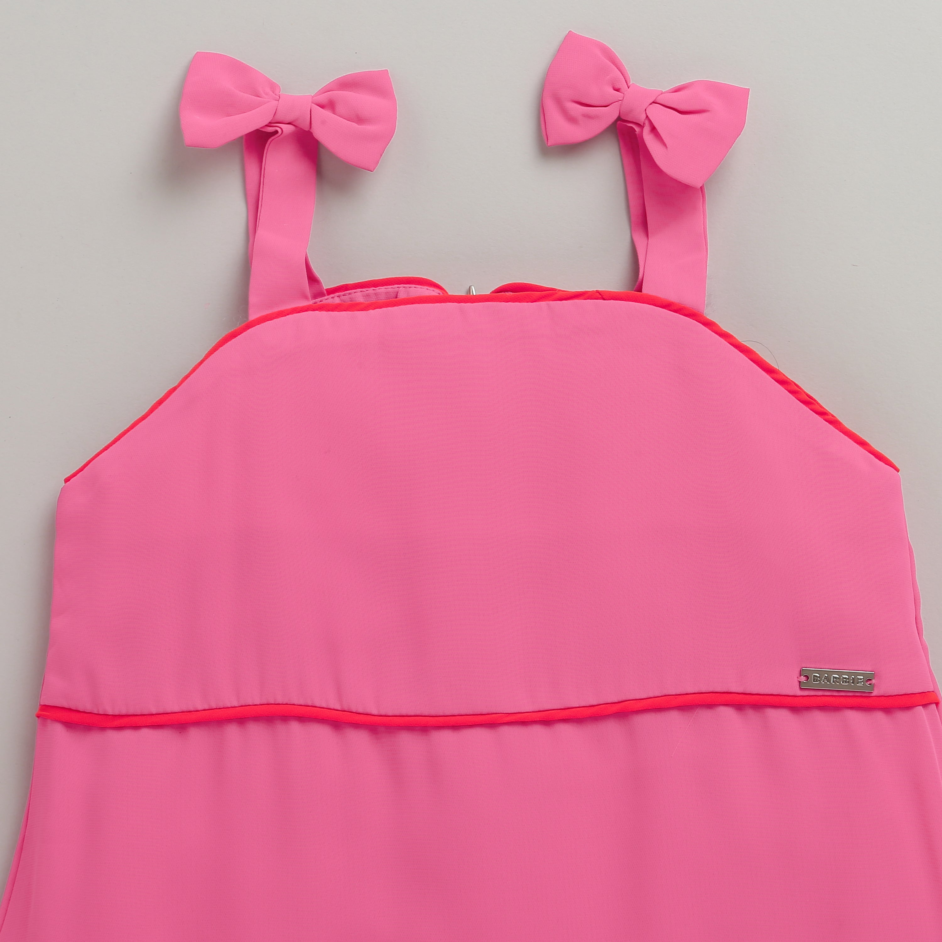 This Barbie Spaghetti Strap Midi dress features a stylish two-color design with a bow detail on the straps and a fixed belt for a flattering fit. Made with high-quality fabrics, it offers both comfort and style. Perfect for any occasion, this dress will make you stand out with its unique and elegant look.