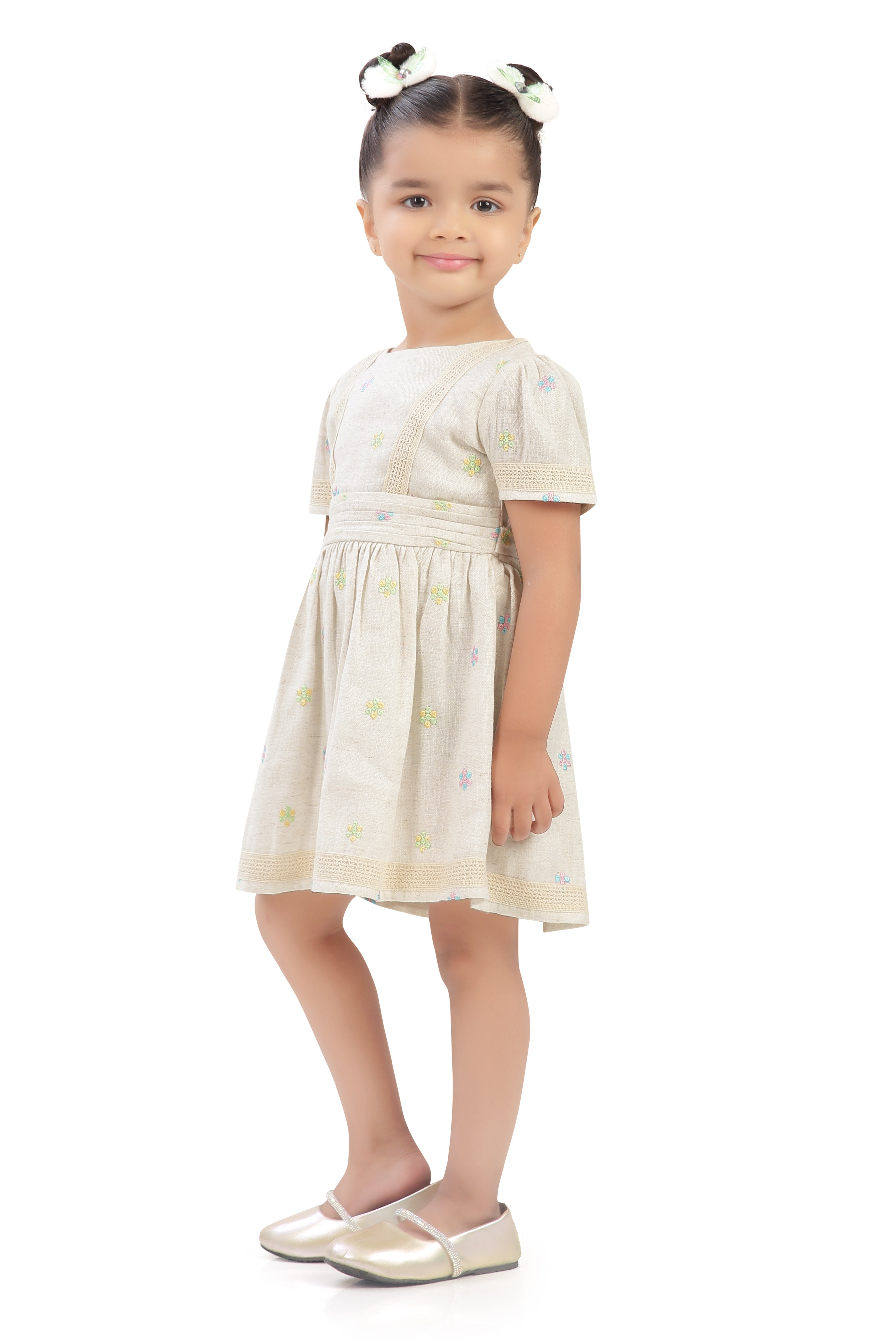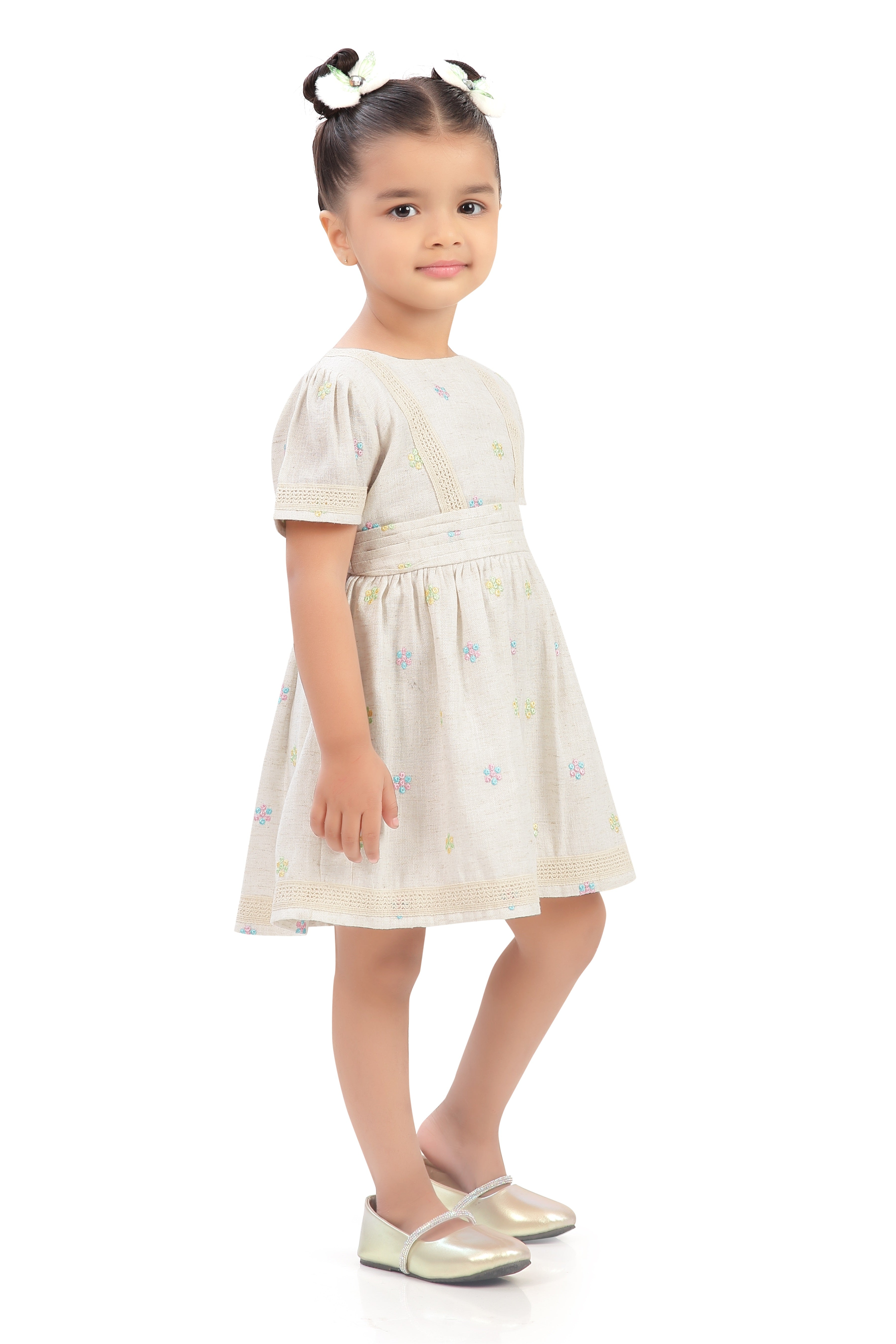 This Tressel off-white midi dress features delicate floral embroidery on breathable cotton fabric, offering both comfort and elegance. Its half sleeves and flared silhouette create a flattering fit suitable for various occasions, combining classic style with modern craftsmanship. Ideal for those seeking a refined yet effortless look.