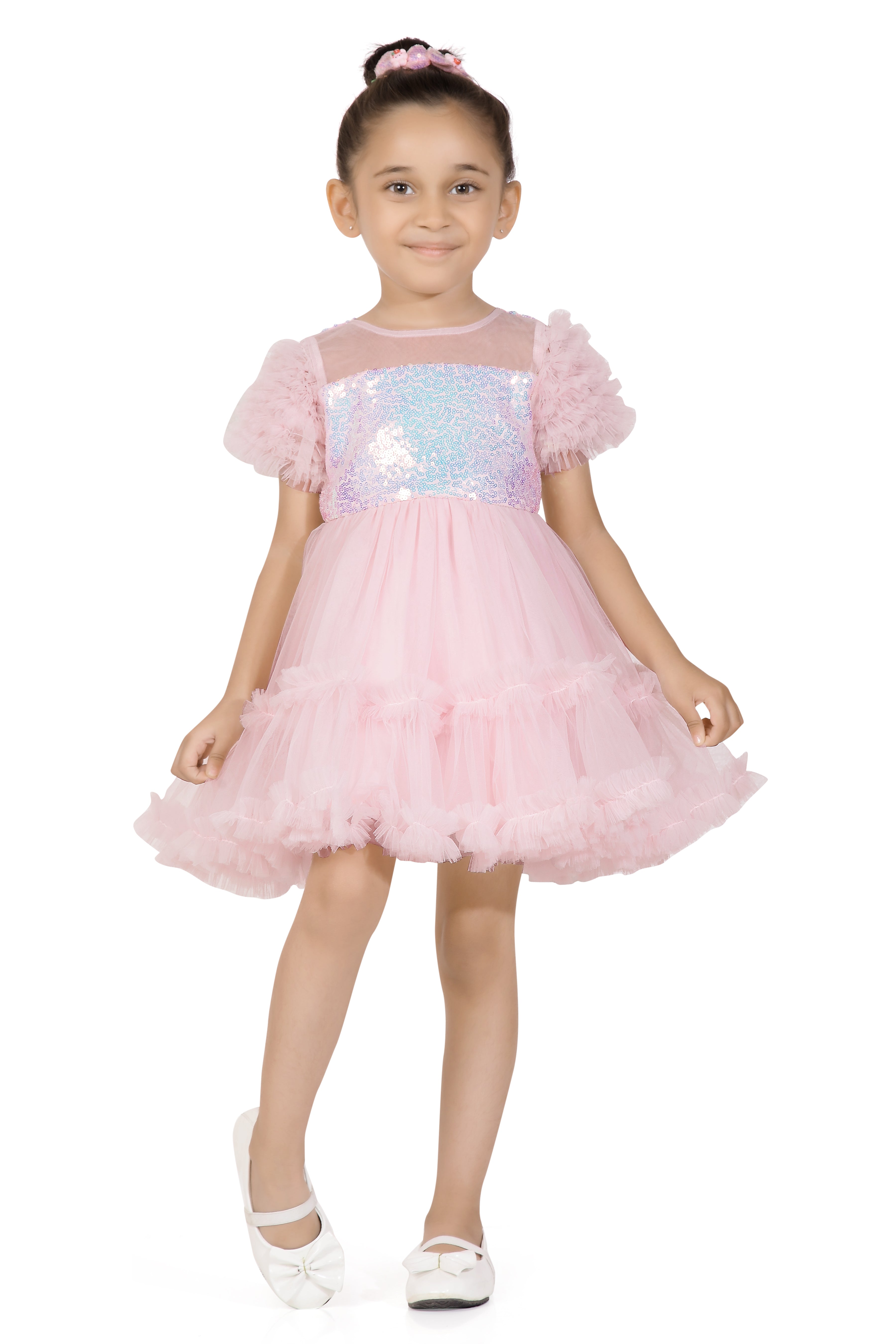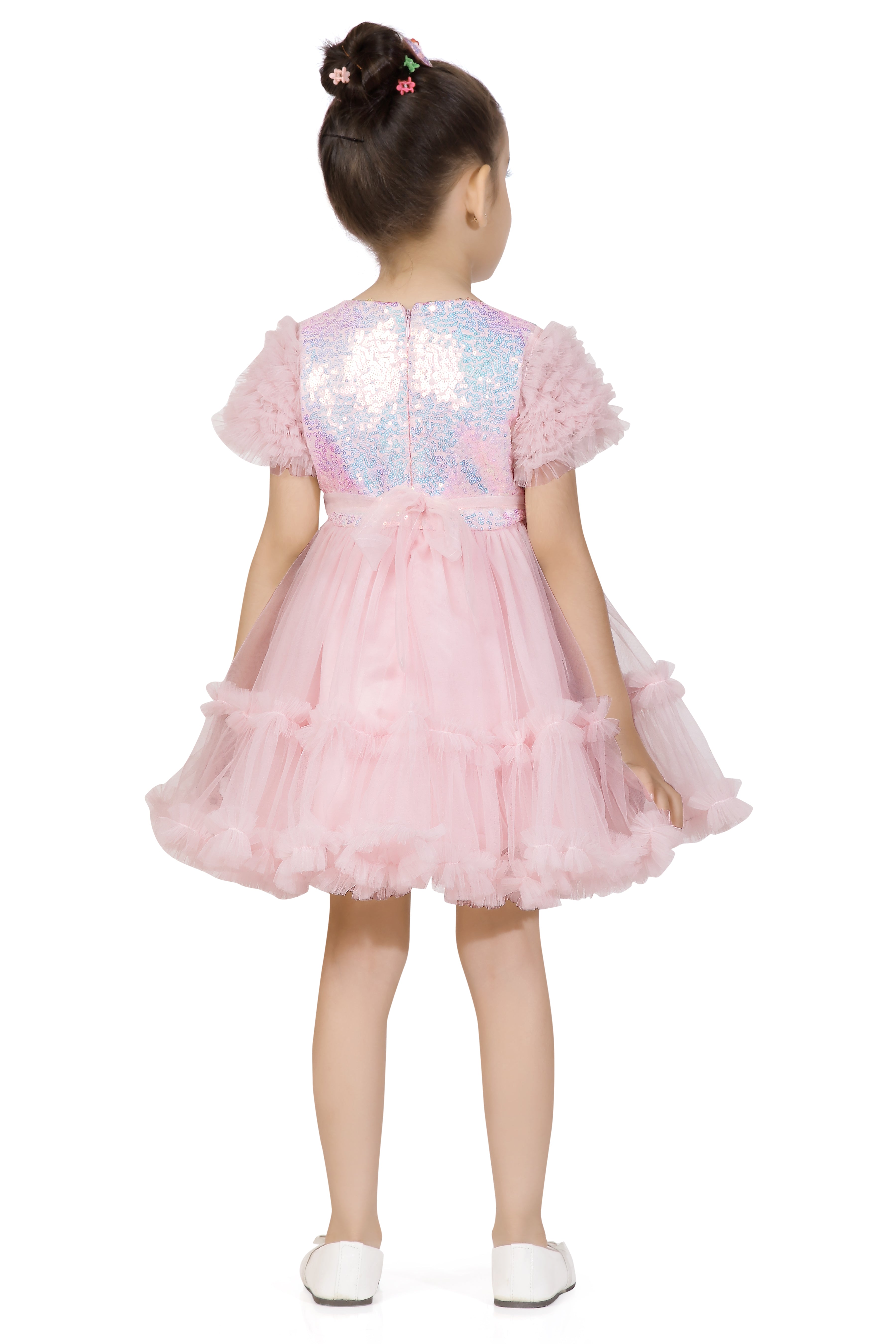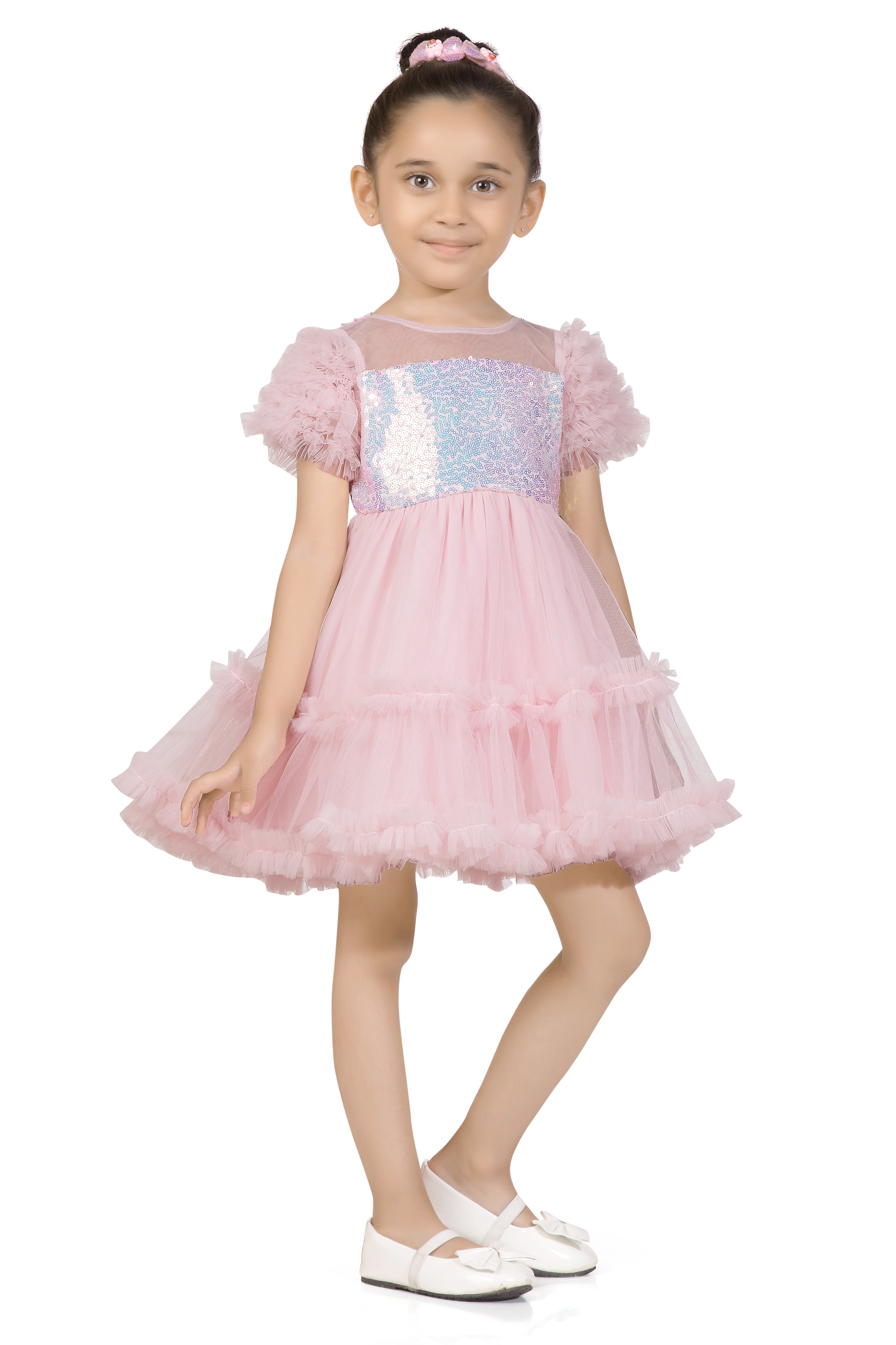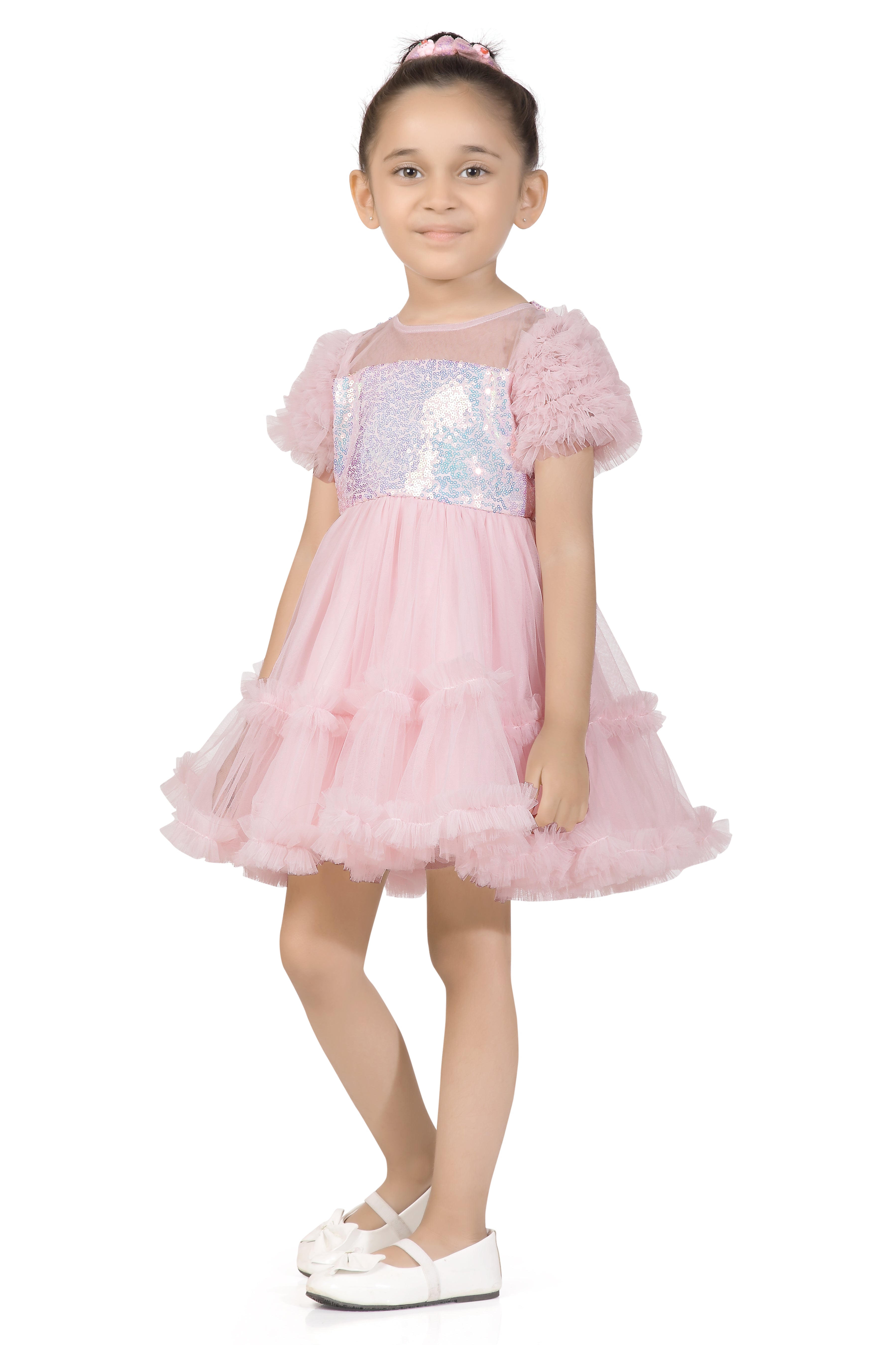 Tressel Sequin Body & Net Flare with Ruffle Sleeve Frock